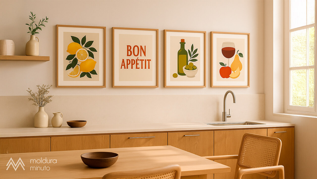 Esses espaços também merecem atenção! Quadros com temas gastronômicos, frases divertidas ou elementos vintage deixam o ambiente mais descontraído e convidativo. Por serem prontos para pendurar, é possível mudar a decoração da cozinha rapidamente e sempre que quiser renovar o visual.